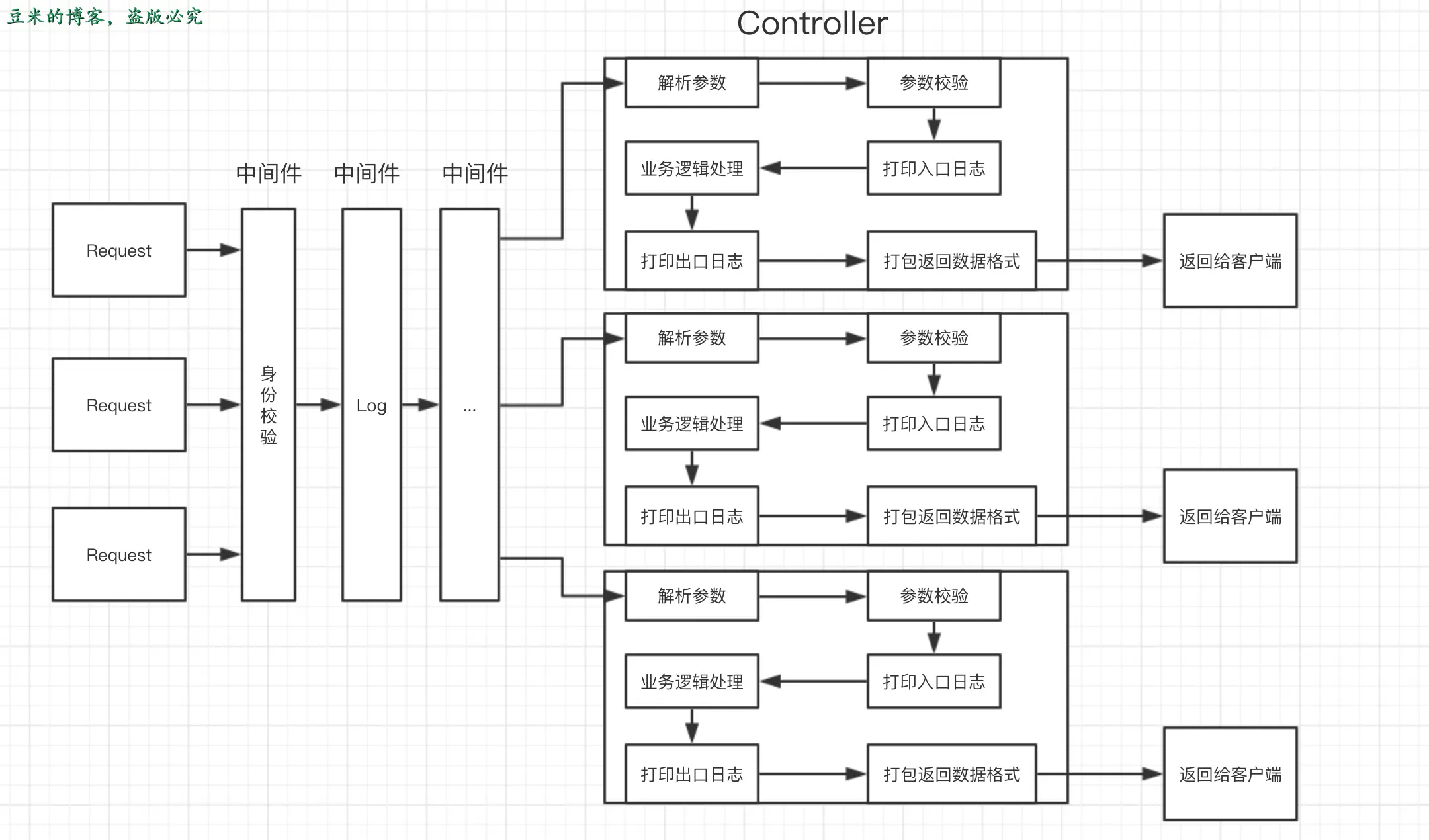 相信这个处理过程,在别的公司也都是成立的。所有的controller代码除了业务逻辑不一样外,剩余的全都是一个套路,都是一套重复代码。起初网关的第一个框架版本就是这样设计的,而引入AOP之后,我们得到的效果图是这样的:
