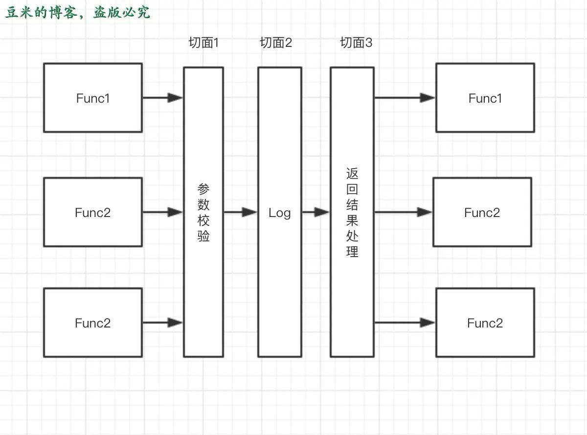 那么针对这些痛点,AOP提出了横切关注点(crosscutting concern)的概念,这些与业务无关但是属于系统范围的需求并且会横跨多个模块的功能称为横切关注点。使用AOP编程模型,我们可以简化出这样的一张图: