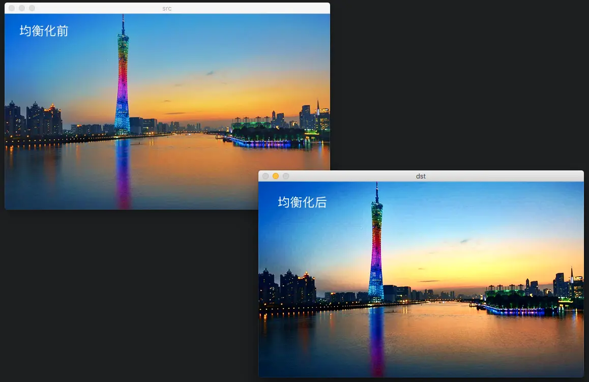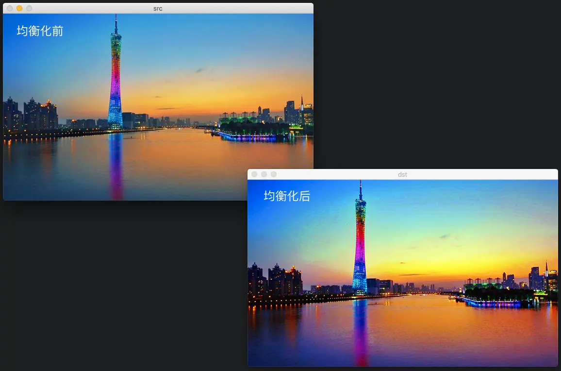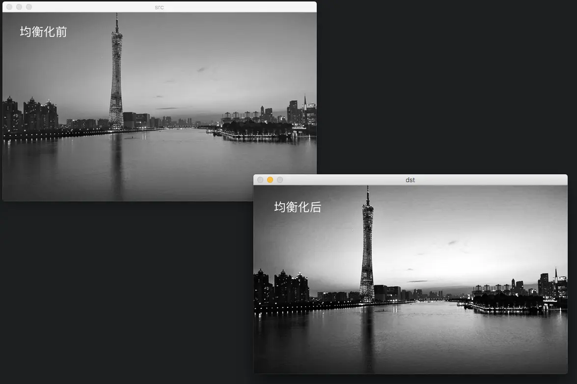 均衡化指的是把一个分布 (给定的直方图) 映射 到另一个分布 (一个更宽更统一的强度值分布), 所以强度值分布会在整个范围内展开.