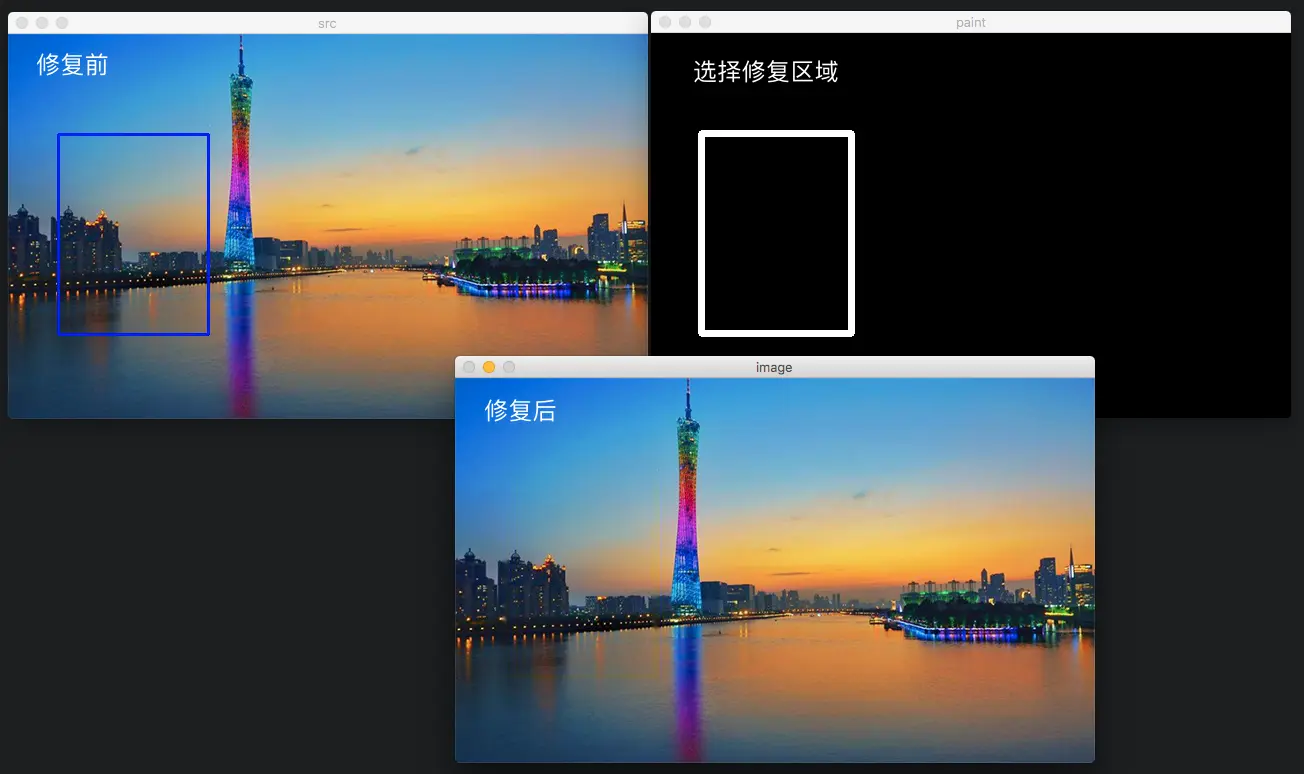 - int flags 表示修复使用的算法 。 opencv提供了两种选择 CV_INPAINT_TELEA 和 CV_INPAINT_NS。