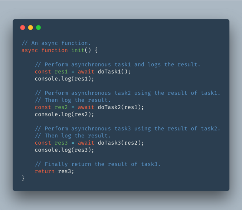 函数体中依次执行三个异步任务,每个任务依赖前一个任务的完成。最后,函数返回最后一个任务的结果。