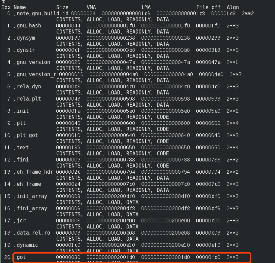 可得 0x74a + 0x20088e = 0x200fd8,发现此处偏移量与重定位表b的那一项的偏移量完全一样,因为在got表中八个字节为一项,可以看出b位于第二项。于是在加载到进程空间后,加载器会对符号重定位后得到的地址填充至got表中,当我们再次访问0x200fd8偏移量时,就能得到变量的真正地址。