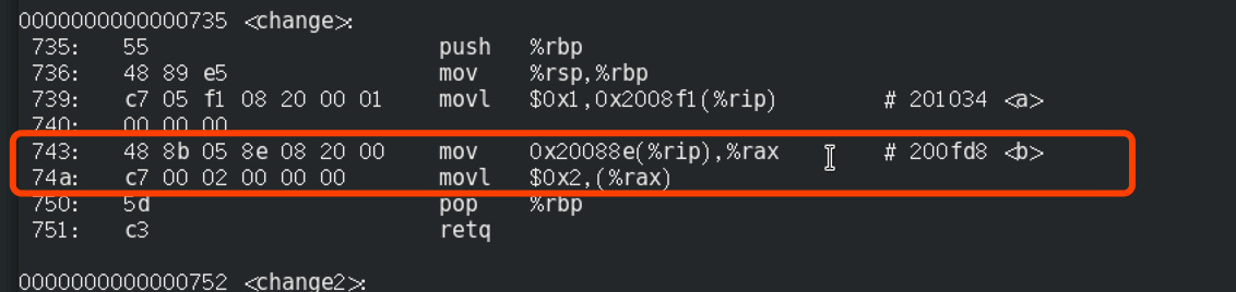 比如上述代码中的change2,对这种函数的访问是最容易解决的问题,因为一个动态库在编译成一个模块之后,其中的指令之间的相对位置是固定的,所以通过一个相对跳转指令即可访问: