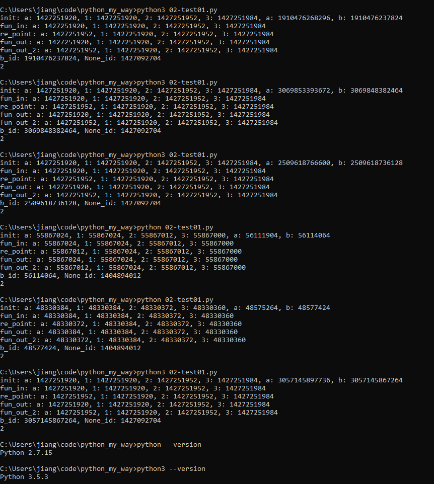 现在写下这段的时候,我上面的那些代码截图是在 python 2.7.15 32位版本跑的。那么我之所以多写了个 3 也是想看下对于内存分配的问题。Windows 下 python 3.5.3 64位 vs python 2.7.15 32位,跑了几遍截图如下: