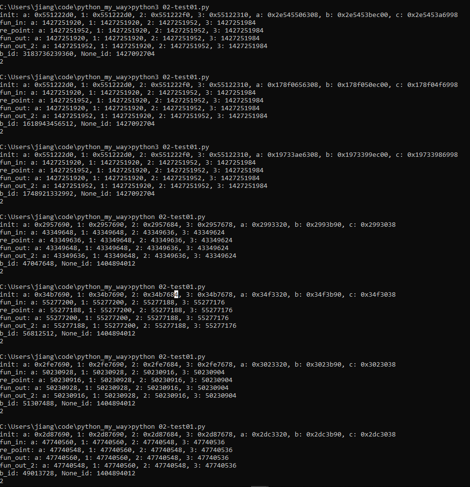print("fun_out_2: a: %s, 1: %s, 2: %s, 3: %s" %(id(a), id(1), id(2), id(3)))