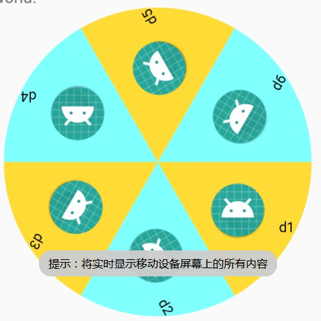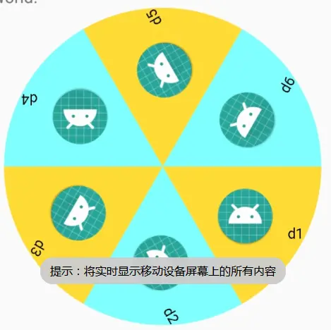 好,看完了Paint 和Canvas的用法之后,你肯定知道可以画出一个扇形的效果,和Canvas可以旋转画布。我的思路是:我要做的就是在某一个起始的地方画出一个扇形,然后给扇形中添加图片和文字。然后再转动画布扇形的角度,这样就相当于回到起始的地方,这样做的好处就是不用频繁的去计算你要画的坐标。就像你写字,你可以选择移动手和移动纸,而我选择移动纸。