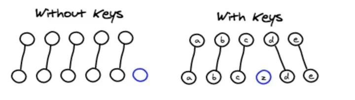 当被diff节点处于同一层级时,通过三种节点操作新旧节点进行更新:插入,移动和删除,同时提供给用户设置key属性的方式调整diff更新中默认的排序方式,在没有key值的列表diff中,只能通过按顺序进行每个元素的对比,更新,插入与删除,在数据量较大的情况下,diff效率低下,如果能够基于设置key标识尽心diff,就能够快速识别新旧列表之间的变化内容,提升diff效率。