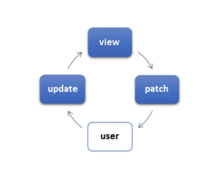 以上是一个通过input事件触发VirtualDOM更新的典型app。在h函数中,不光可以为VirtualDOM保存数据属性,还可以设置事件回调函数,并在其中获取并处理相关的事件属性,如update回调中的event对象。通过捕获事件中创建新的vnode,与旧的vnode进行diff,最终对当前的oldVnode进行更新,并向用户展示更新结果,他的工作流程如下: