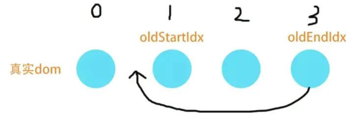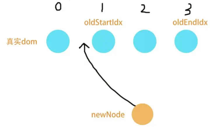 - 当oldEndVnode,newStartVnode相同时,也就是oldEndVnode成为了新的头部节点,就将oldEndVnode插入到oldStartVnode前一个位置