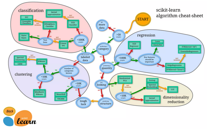 幸好,Python上的机器学习工具包 scikit-learn 不仅给我们提供了方便的接口,供我们调用,而且还非常贴心地帮我们做了小抄(cheat-sheet)。