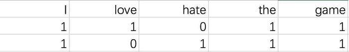对每一句话,都分别计算特征出现个数。于是上面两句话就转换为以下表格:
