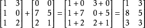 通常的矩阵加法被定义在两个相同大小的矩阵。两个m×n矩阵A和B的和,标记为A+B,一样是个m×n矩阵,其内的各元素为其相对应元素相加后的值。例如: