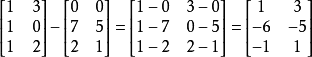 也可以做矩阵的减法,只要其大小相同的话。A-B内的各元素为其相对应元素相减后的值,且此矩阵会和A、B有相同大小。例如: