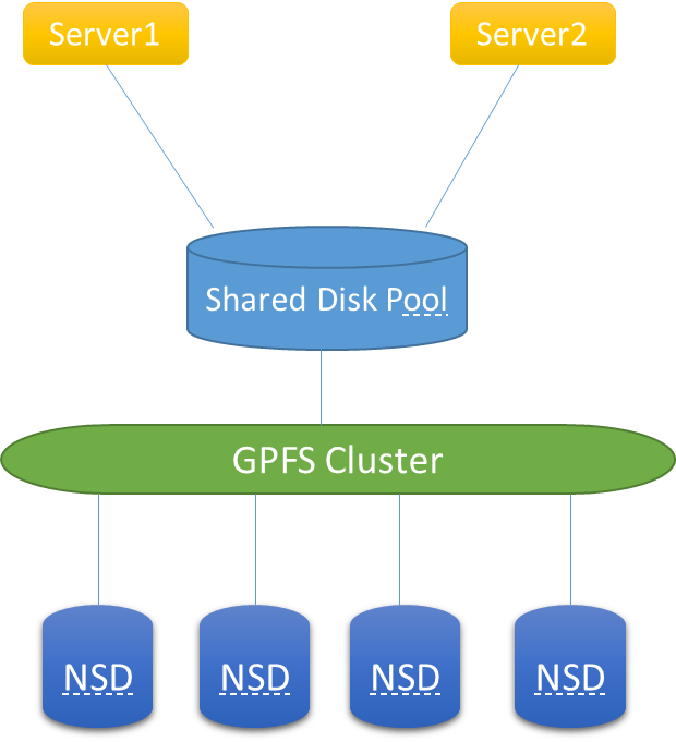 - 集群将生成的 NSD 盘按照不同的需求生成多个或单个共享磁盘,供上层服务器挂载。