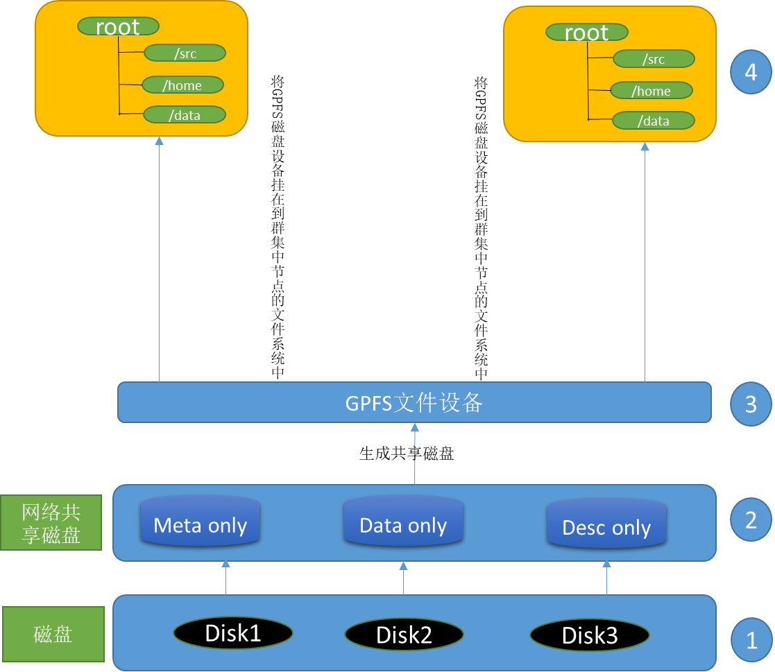 - 本地磁盘将被发现并添加到全局的命名空间中,形成网络共享盘(NSD),供集群调用。