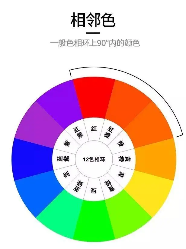 相邻色:红+橙、黄+绿、绿+蓝、蓝+紫...
