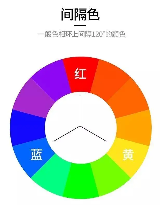 色相环的作用除了分辨色相,还能让我们了解一些配色的常用选色方法,例如:相邻色、间隔色、互补色,就是我们平时选色用到的理论,下面在色相环上去看这些颜色搭配: