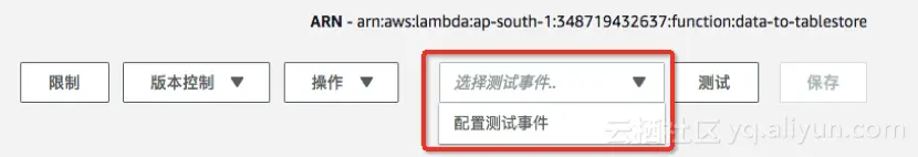 点击右上角的 配置测试事件,输入示例事件的json内容。