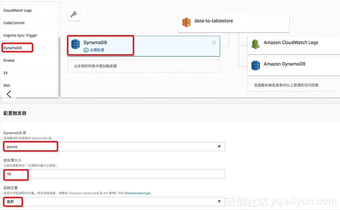 点击事件源的DynamoDB图标,进行事件源配置,选择 source 数据表批处理大小先选择为10进行小批量验证,在实际运行过程中建议为100,由于表格存储的Batch操作最大为200条数据,故不能超过200。