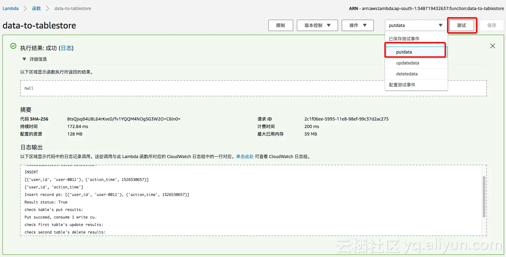 依次选择putdata、updatedata和deletedata,会发现表格存储中的数据也会随之更新和删除。
