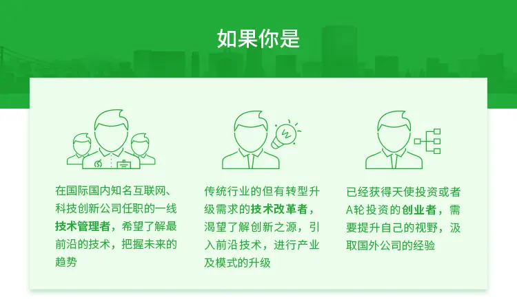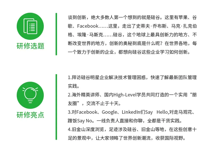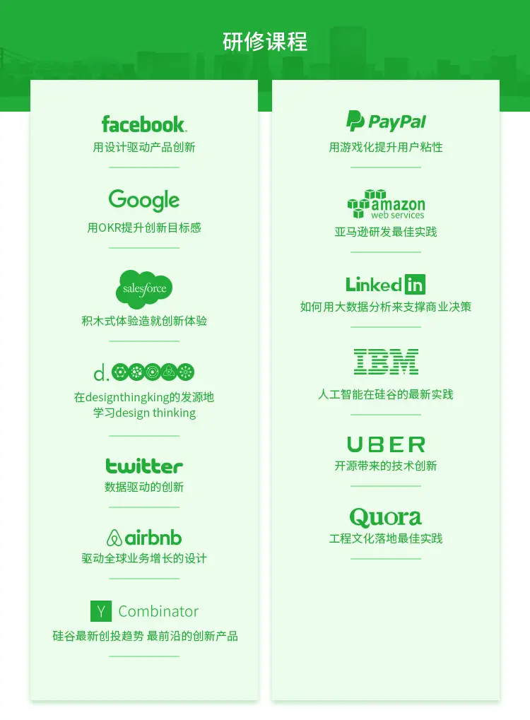 走进硅谷,发现趋势与机会,与一线技术团队负责人面对面探讨交流研发团队实践;学习美国一流科技公司的研发实践和产品创新理念,了解美国当前互联网、移动互联网最新技术发展和技术热点,深入企业内部了解公司文化,学习先进团队管理经验。