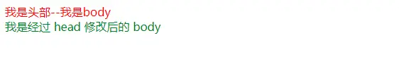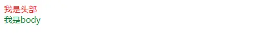此时运行代码,打开页面,我们可以看到,在 head 中已经出现了红色字体的‘我是头部’,在 body 中出现了绿色字体的‘我是body’。