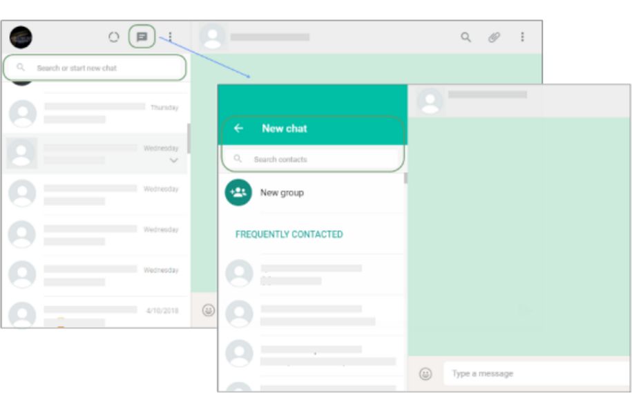 App中有两种创建新聊天的方式:(1)在聊天列表中搜索(2)先点击“新聊天”图标,再搜索联系人。然而,用户很难区分这两个选择。