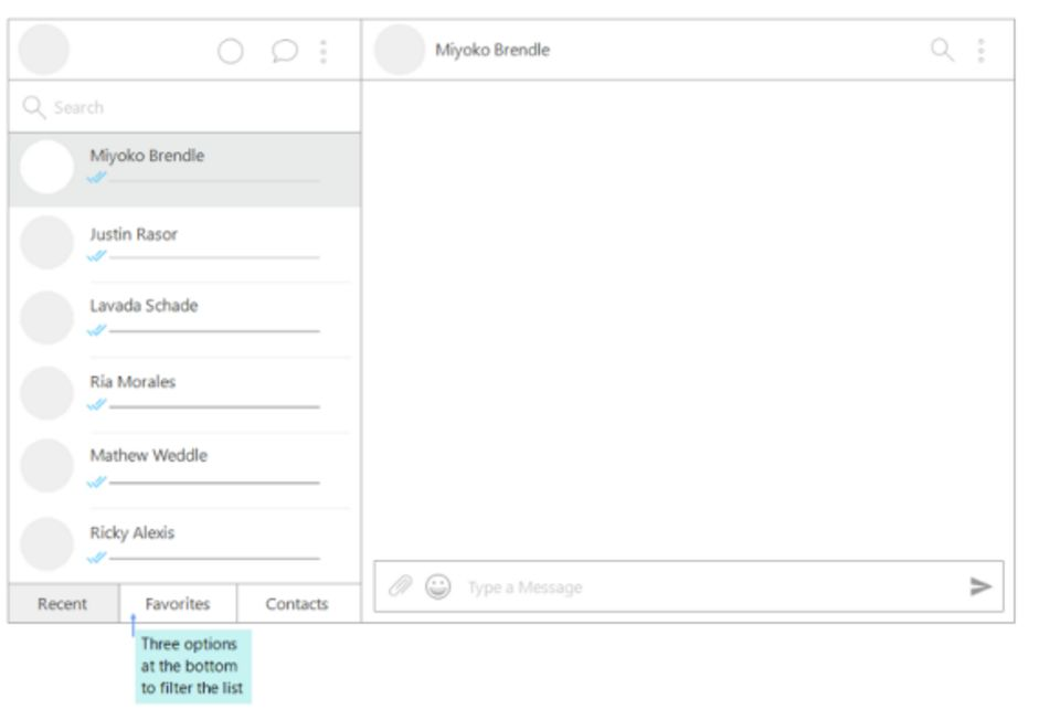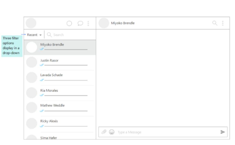 聊天列表和联系人列表需要明确的区分。这可通过在联系人列表中添加过滤器来完成,也可以根据“最近聊天”或“联系人姓名”对单个列表进行排序。