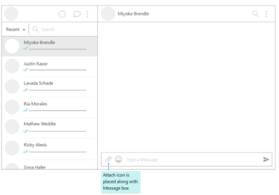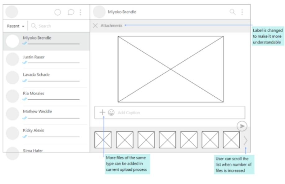 预览区域重命名附件以避免用户混淆。在缩略图区域提供滚动功能。用户可以通过消息栏中的添加图标来增添更多文件。