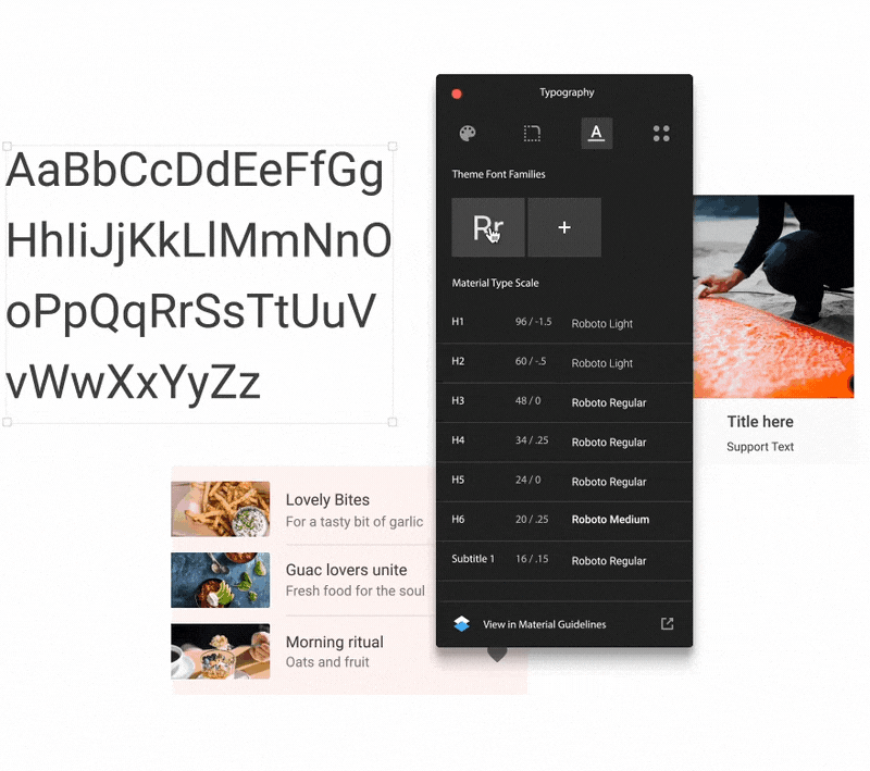 主题编辑器可帮助你制作自己的品牌 UI 组件库,并提供全局样式更改方案,可以应用于颜色,形状和排版。目前可用于 Sketch,通过下载 sketch 插件来进行应用。