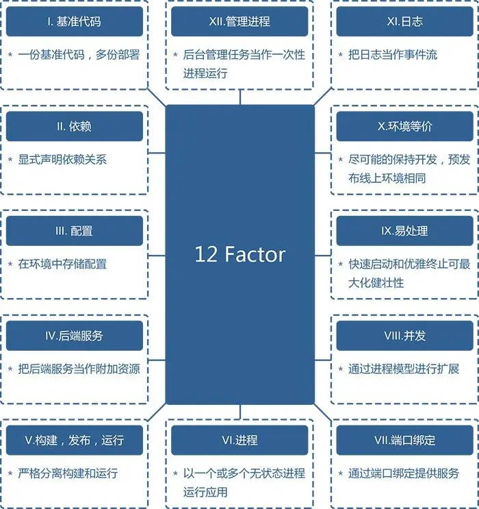 以上是模块内部常见的设计原则,对于模块之间,则是对于云原生应用常说的十二要素原则。