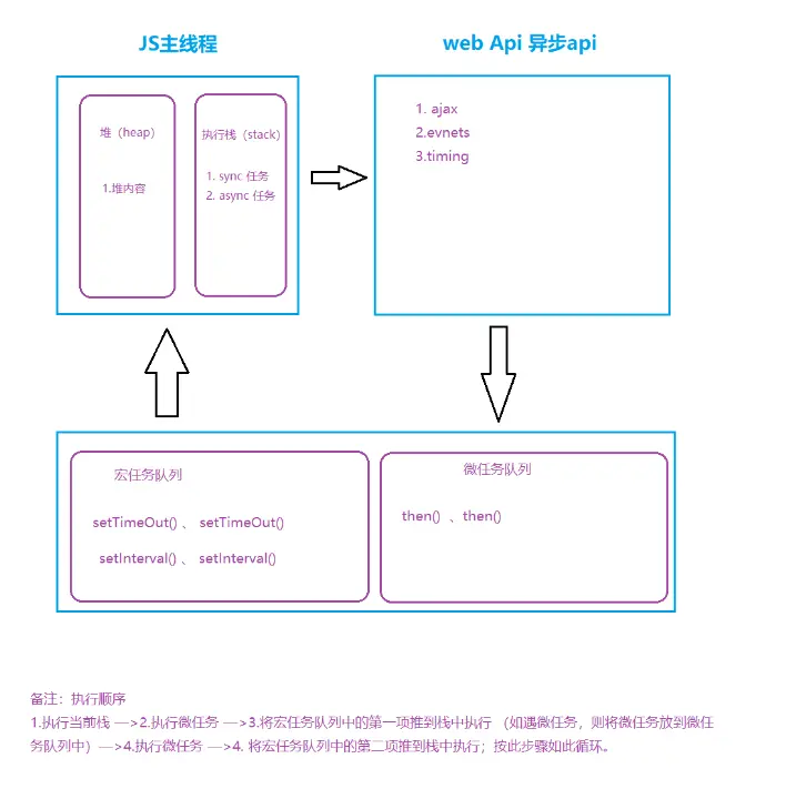 1. 函数入栈,当Stack中执行到异步任务的时候,就将他丢给WebAPIs,接着执行同步任务,直到Stack为空;