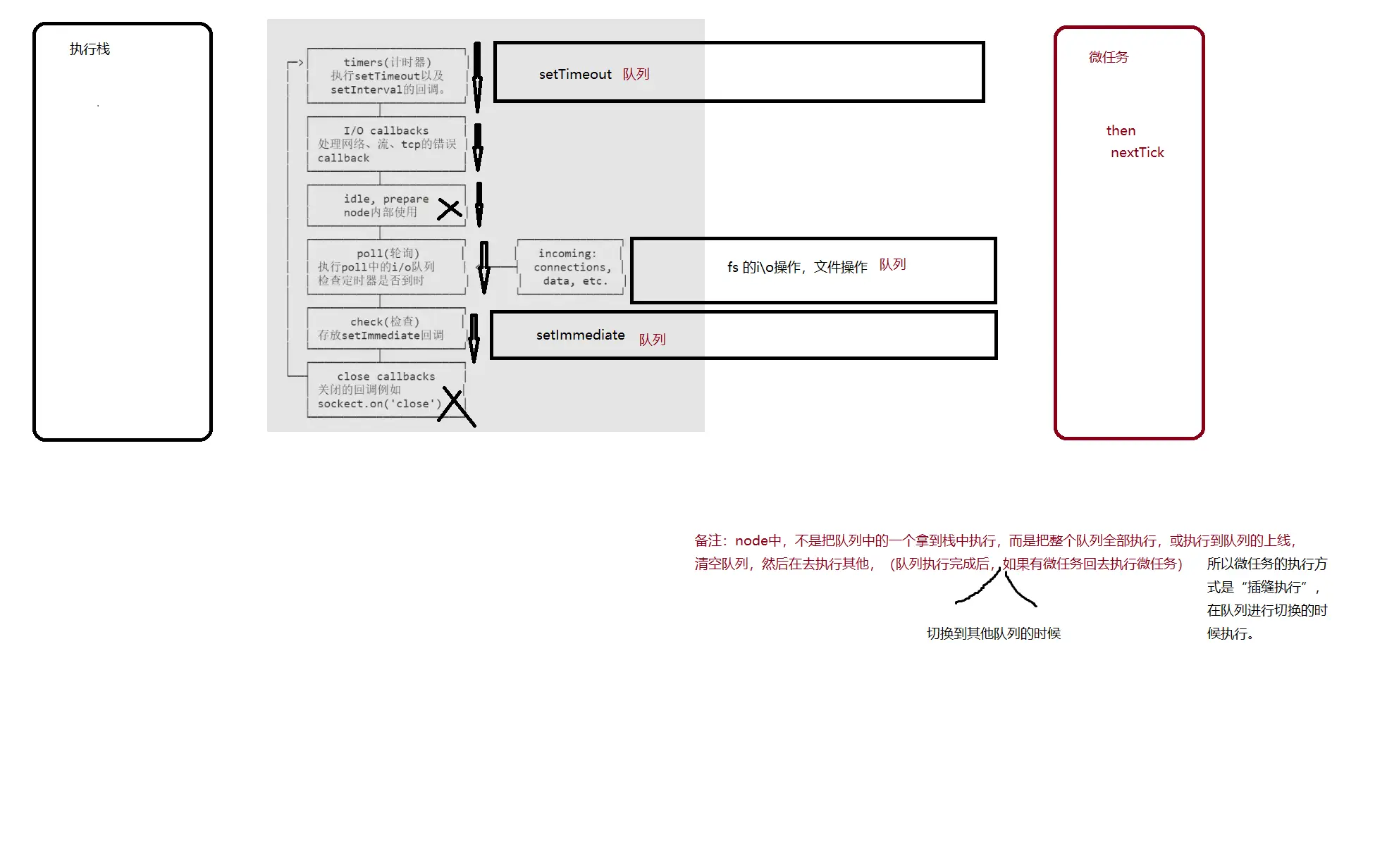 图虽然有些乱,但是我们只需关心timers计时器阶段和poll轮询阶段,check检查阶段即可,clons关闭阶段以及微任务队列即可。