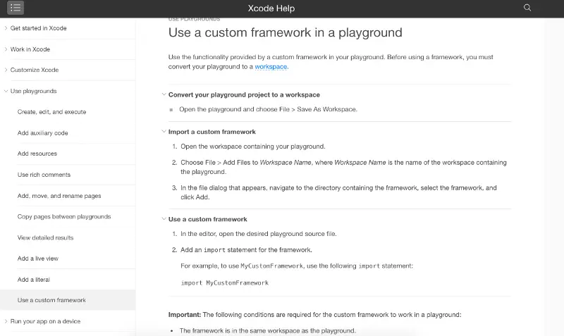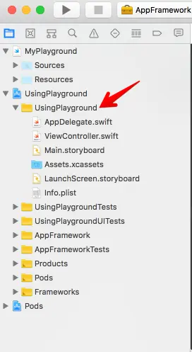 如果 Playground 作为嵌套项目添加,Playground 无法访问同一工作区或父项目中的代码。为此,你需要创建一个框架,然后添加在你打算在 Playground 中开发的源文件。我们称之为应用框架。