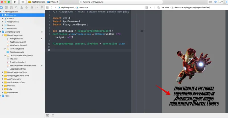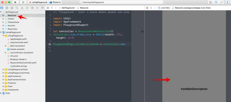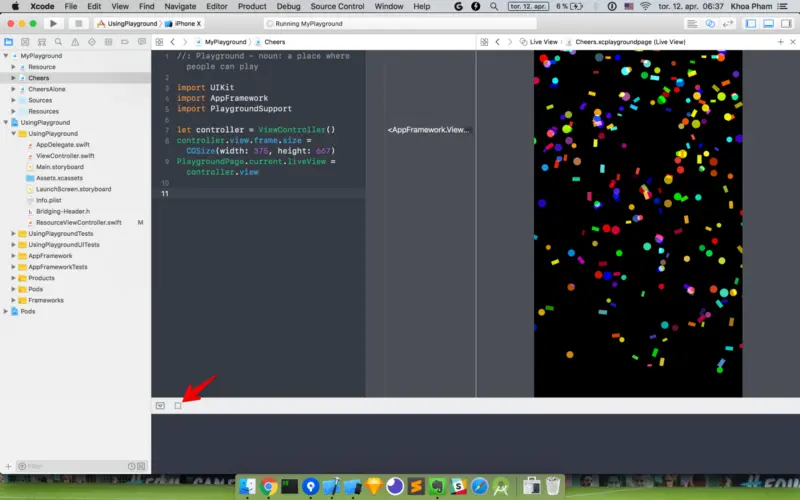 现在来到了最后一步:编写一些代码。在这里我们需要在 Playground 导入 AppFramework 和 Cheers。我们需要像在应用工程中一样,导入 Playground 中所有使用的 Pod。