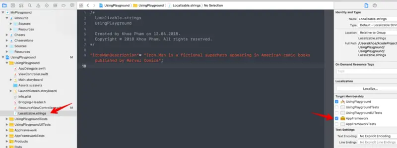首先,我们需要在 AppFramework target 添加资源文件。选择 Asset Catalog 和 Localizable.strings 并将它们添加到 AppFramework target。