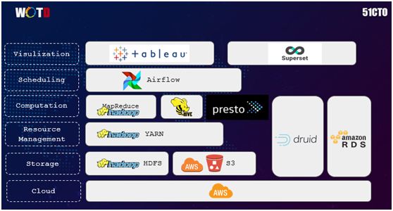 其右边对应的分别是:负责界面显示的 Airpal、简易的数据搜索分析工具Caravel、和 Tableau 公司的可视化数据分析产品。