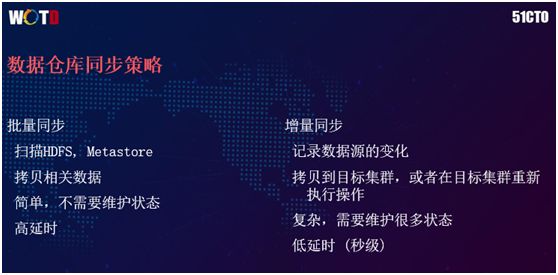 批量同步。优点是:扫描 HDFS、Metastore,拷贝相关的数据,简单粗暴、也不需要维护状态; 缺点是:当您的存储容量变得很大时,延时会比较高。