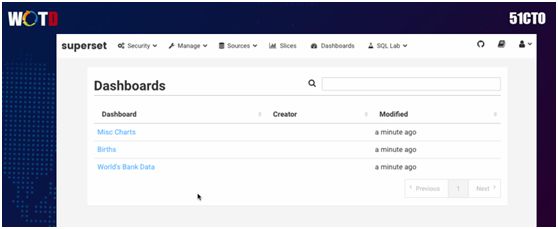 Superset 的功能比较强大,您可以自行建立不同的 Dashboard(仪表盘),它支持各种应用数据的查询,并能以曲线、饼图或表的形式展示出来,还能定制化显示页面。