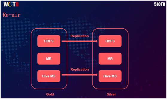 上图是 Re-air 的抽象逻辑图,其中最重要的就是实现在 Gold、Cluster 和 Silver Cluster 之间 HDFS 的实时同步。另外在它对所有数据同步的过程中,也能具有去重的效果。
