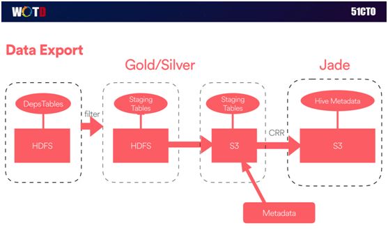 上图是数据输出的简要逻辑图。最左边是全球的数据表输入,由于安全性的原因,我们通过 Filter 进行过滤,并且在生产环境中建立了一个基于 HDFS 的 Staging Table。