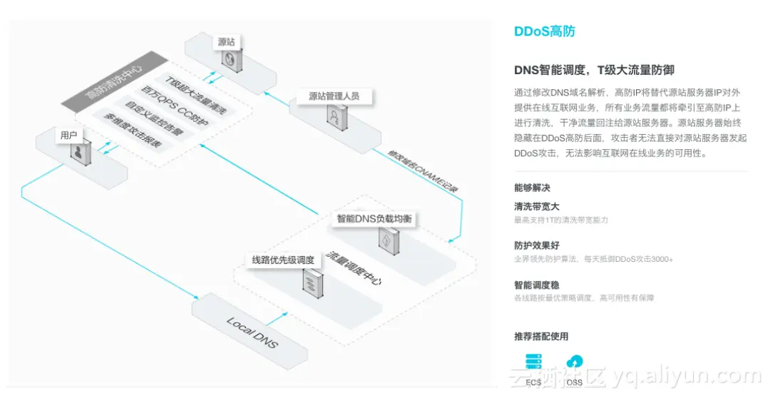 在架构上,基于阿里云CDN平台,结合 DDoS高防清洗资源,形成了一张分布式的安全加速网络,兼顾加速和大流量清洗防护需求。