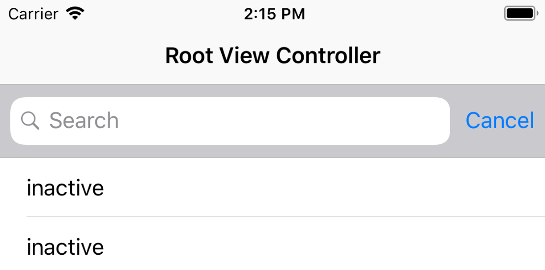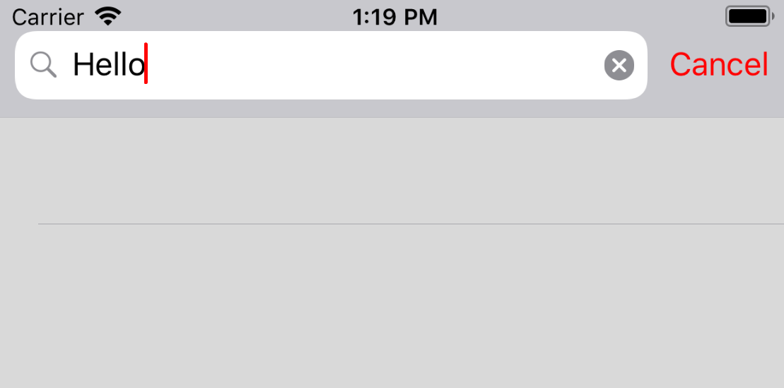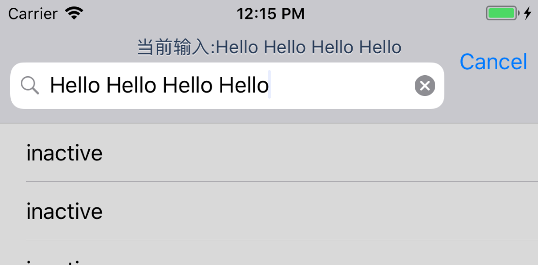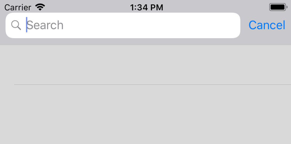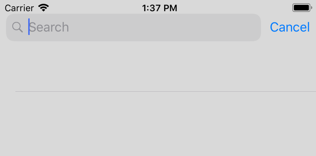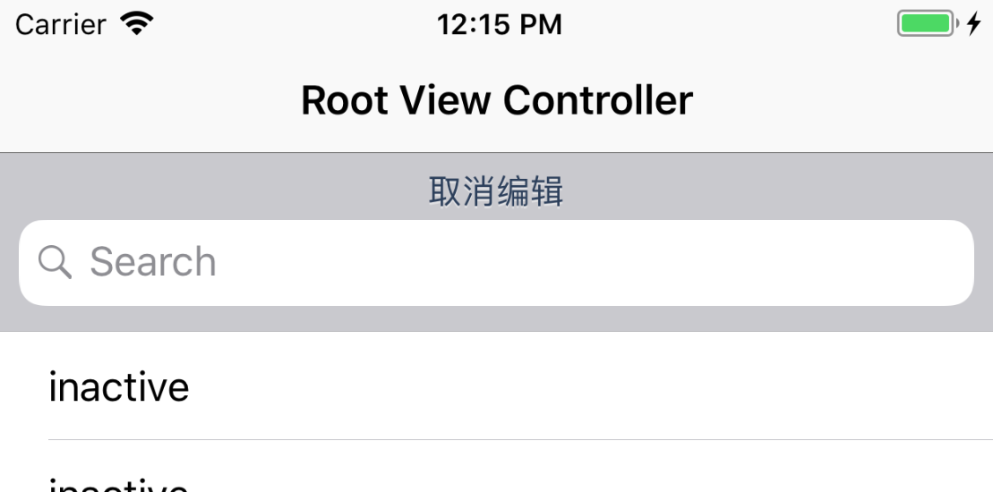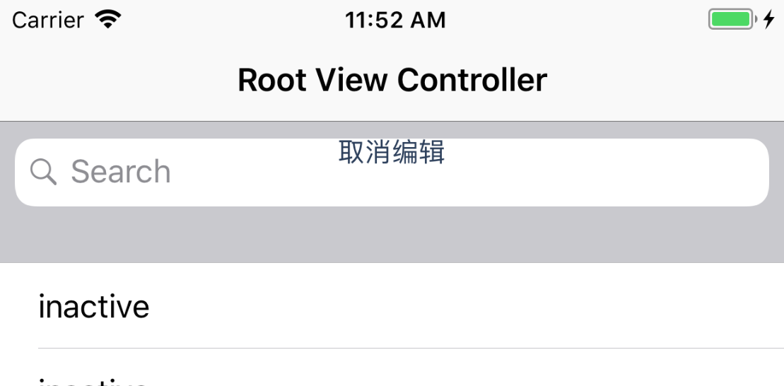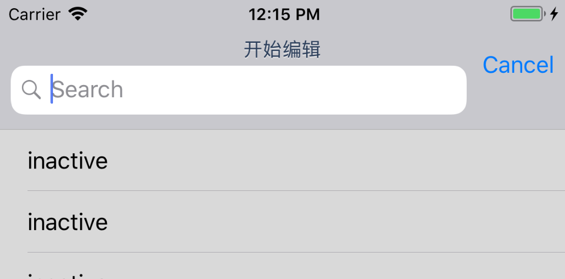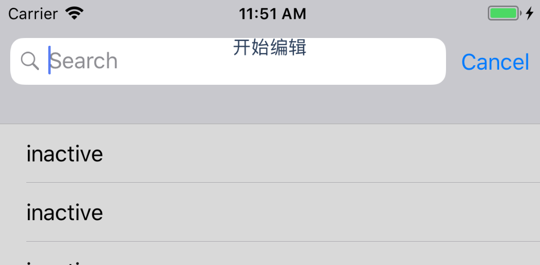 可以发现取消按钮先显示了一下,然后隐藏了,效果并不理想。如果想彻底隐藏取消按钮,有一种方法是继承 UISearchController 和 UISearchBar 实现自定义。代码如下:
