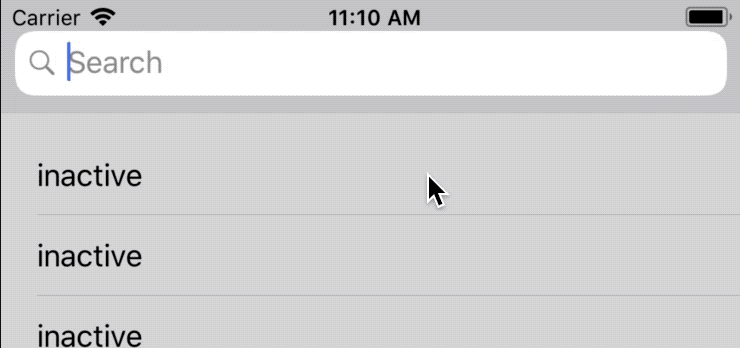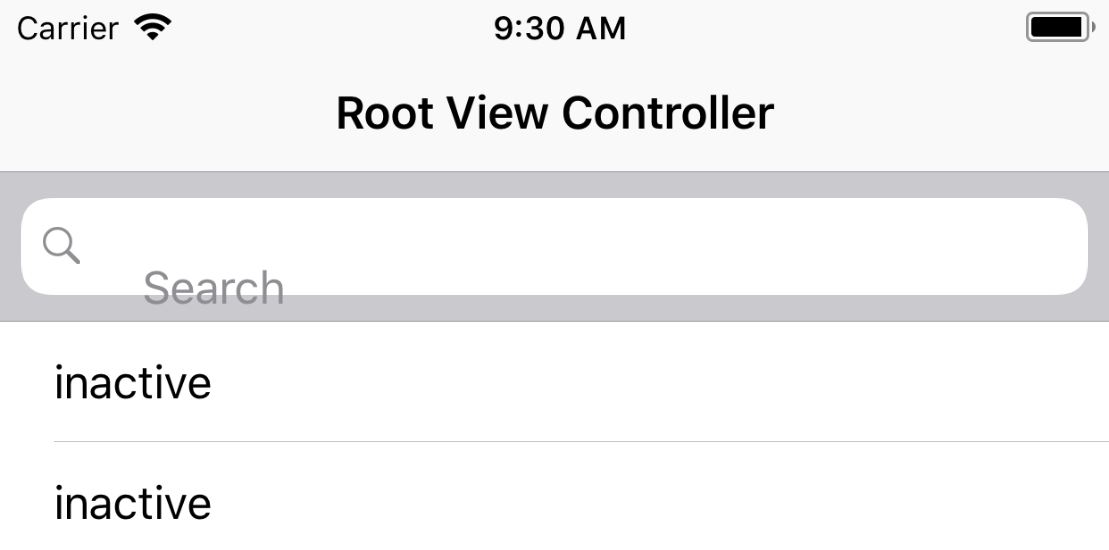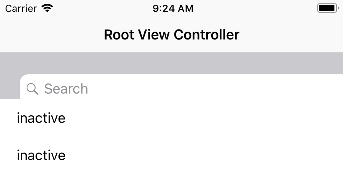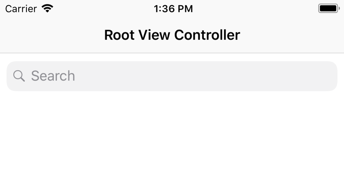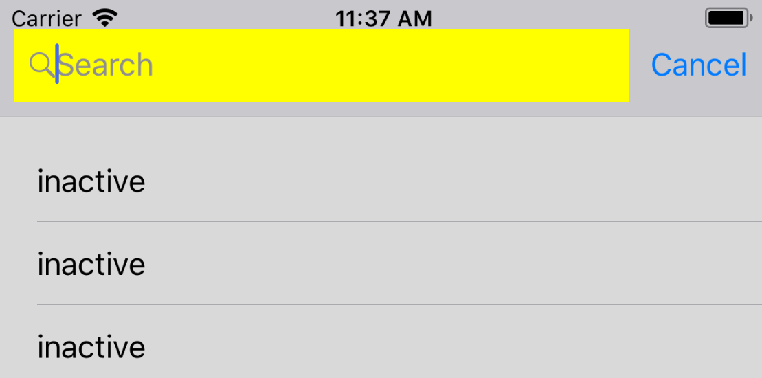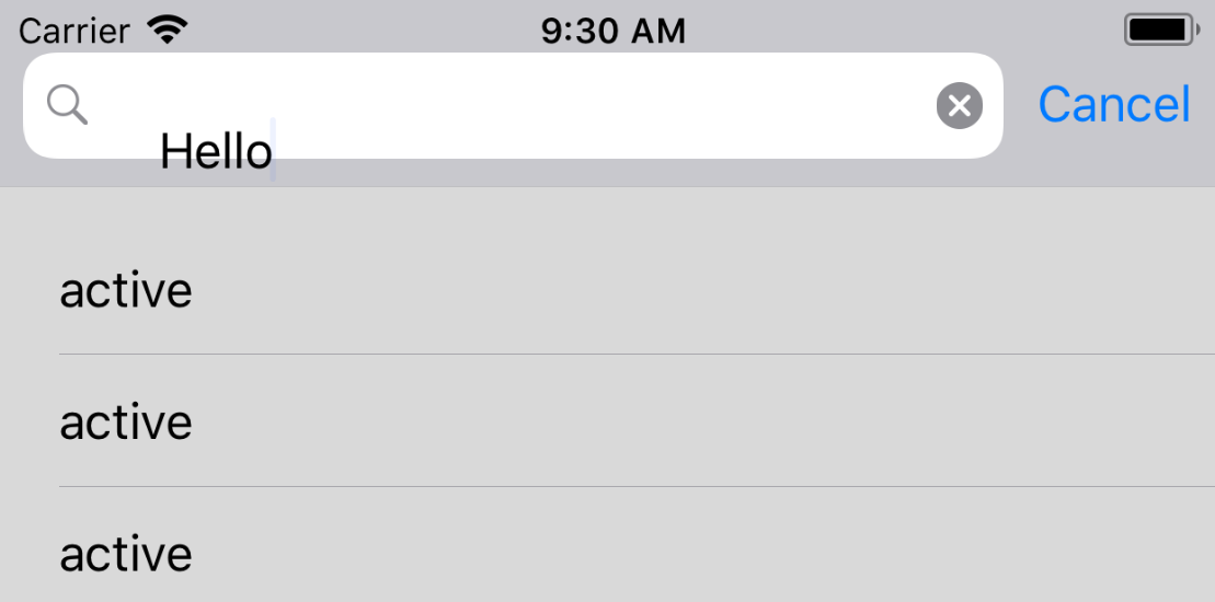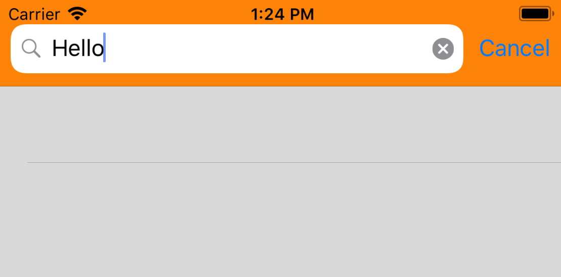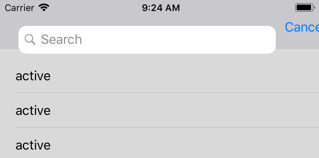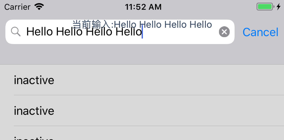 可以发现取消按钮先显示了一下,然后隐藏了,效果并不理想。如果想彻底隐藏取消按钮,有一种方法是继承 UISearchController 和 UISearchBar 实现自定义。代码如下: