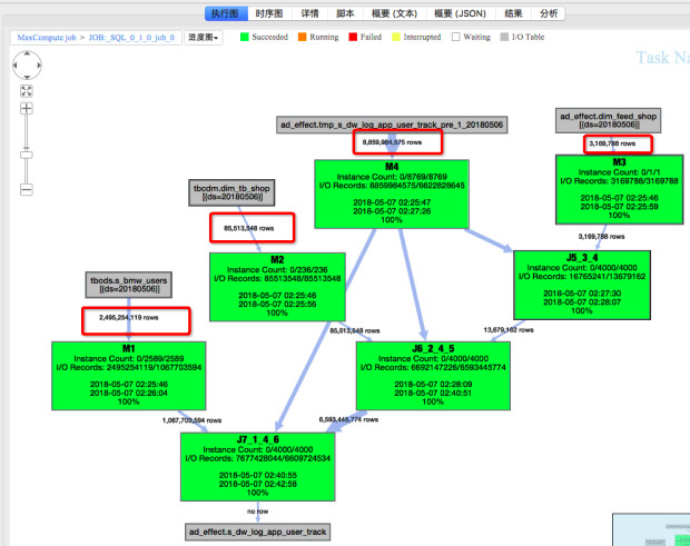 (1)J6_2_4_5 task是整个作业瓶颈,时间消耗最多,从task热度图中也能发现该节点明显热于其它节点。(时间热度图上越红代表运行时间越长,数据热度图上越红代表处理数据越多)
