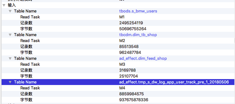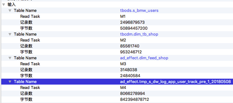 第二步要看一下作业输入数据量有没有明显变化,有可能是某一天输入表或分区的数据量暴涨导致了作业执行变慢。作业输入数据在 Detail 页面左侧,那里列出了这个作业所有输入的数据表和最终输出的数据表。 展开 输入->Table Name 可以查看详细信息,包括是哪个 Fuxi 任务读取了这个表,读取了多少条记录以及读取的数据量大小。这些信息,也标注在作业执行计划图 graph 上,方便查看。如下图所示,