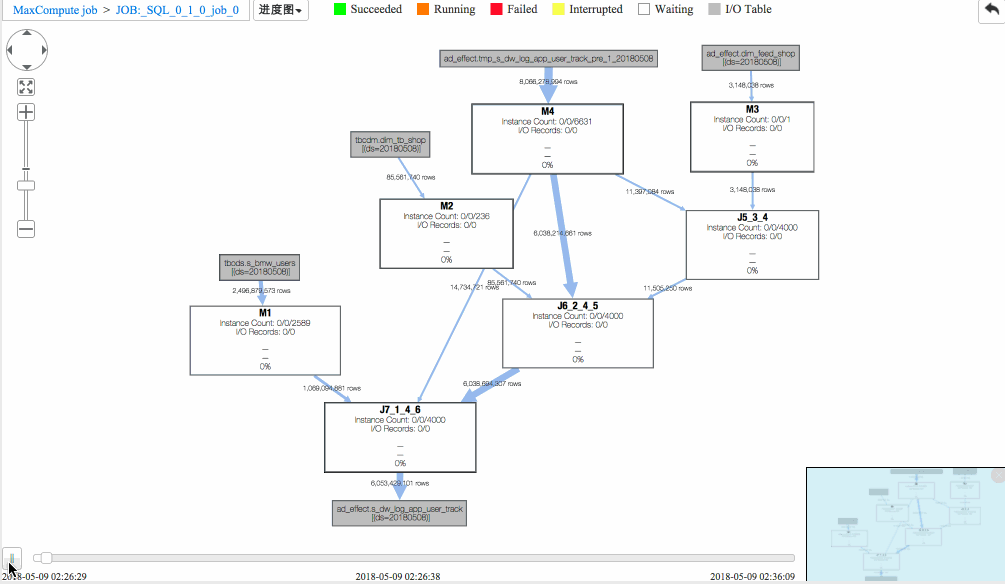 在 Studio 中作业执行计划图底部提供的作业回放工具条,允许用户在 30 秒内快速回放作业执行进度的全过程!这样我们就可以迅速地了解到底是哪个 Task 耗时最多,或者处理得数据最多,或者输出的数据最多等等。