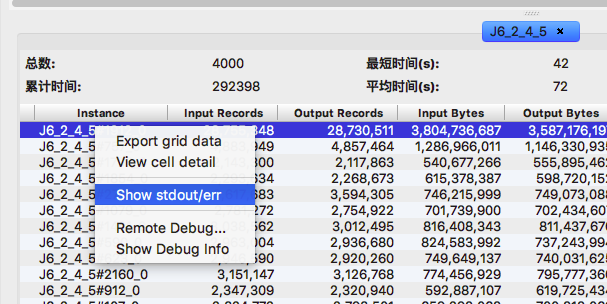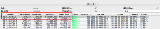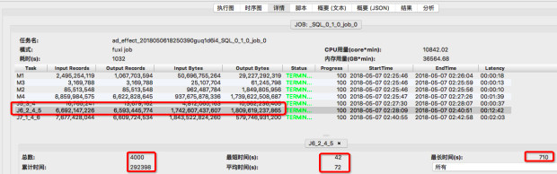 关注上图中J6_2_4_5 输入数据量和统计信息,通过比较可看出,两次执行的J6_2_4_5 输入数据量基本相同,1.58万亿字节 vs 1.7万亿字节,从统计信息来看,累计执行时间及平均时间也基本相同:292398 vs 307628, 72s vs 76s 但作业一 fuxi instances中的最长执行时间为710s, 由此可以认定是某几个fuxi instance长尾导致了J6_2_4_5 这个fuxi task的长尾。
