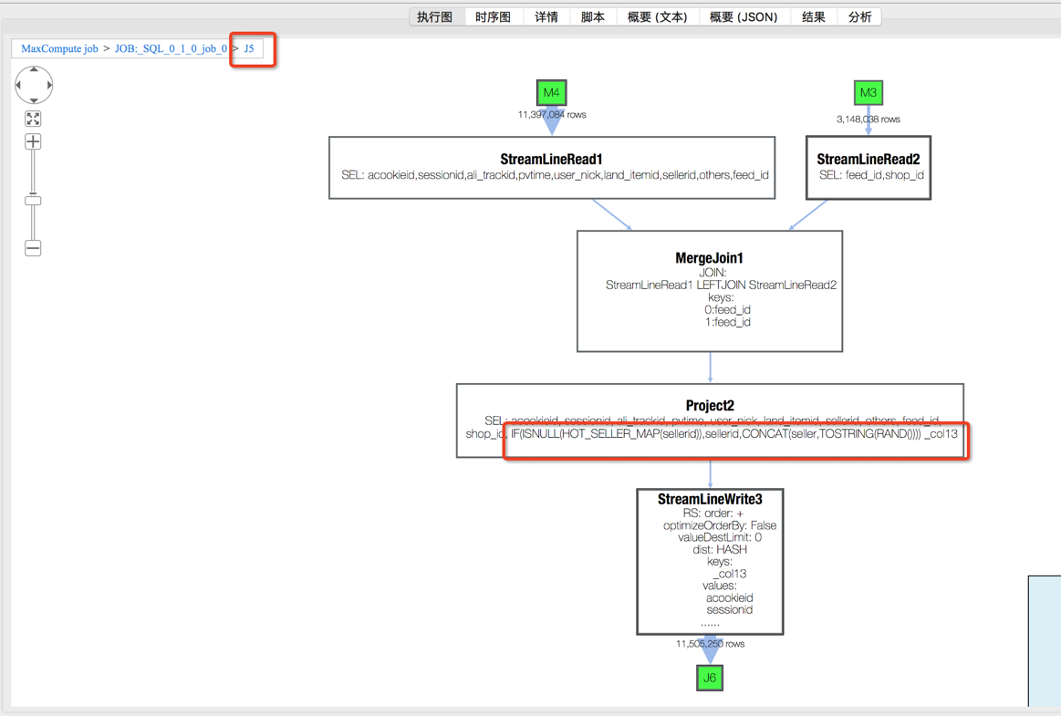 从Merge Join2中可看到join key:_col13, user_id。 其中_col13 来自于J5, 点开J5后发现_col13来自IF(ISNULL(HOT_SELLER_MAP(sellerid)),sellerid,CONCAT(seller,TOSTRING(RAND()))) 说明_col13由seller决定,该seller来自于M4和M3。