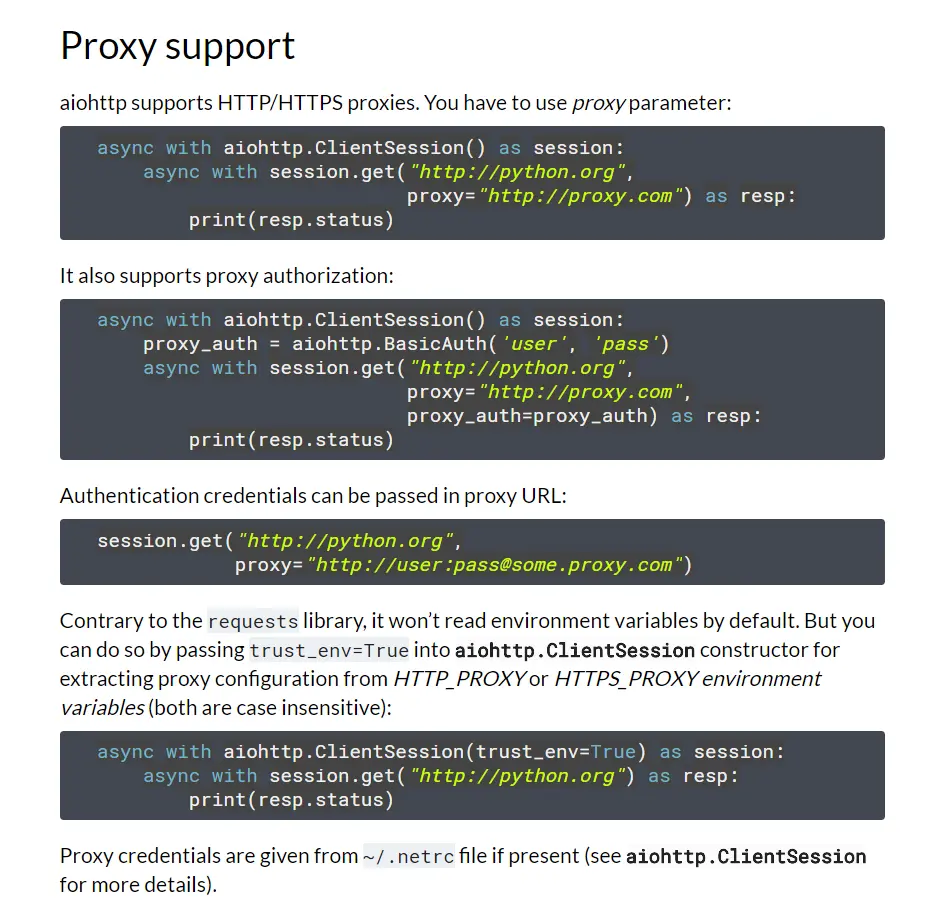 整个项目都是基于 aiohttp 这个异步网络库的,在这个项目的文档中,关于代理的介绍是这样的。